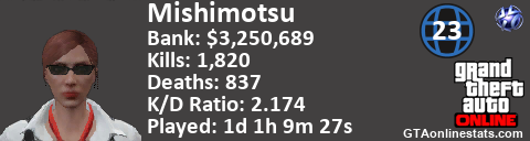 [URL=http://GTAonlinestats.com/showplayer/Mishimotsu/2][IMG]http://GTAonlinestats.com/signature/Mishimotsu/2/sig.png[/IMG][/URL]