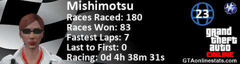 [URL=http://GTAonlinestats.com/showplayer/Mishimotsu/2][IMG]http://GTAonlinestats.com/racesignature/Mishimotsu/2/sig.png[/IMG][/URL]