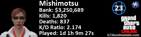 <a href="http://GTAonlinestats.com/showplayer/Mishimotsu/2"><img src="http://GTAonlinestats.com/randomsignature/Mishimotsu/2/sig.png" alt="Mishimotsu" border="0" /></a>