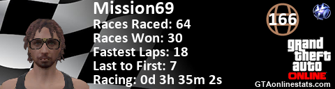 <a href="http://GTAonlinestats.com/showplayer/Mission69"><img src="http://GTAonlinestats.com/racesignature/Mission69/sig.png" alt="Mission69" border="0" /></a>