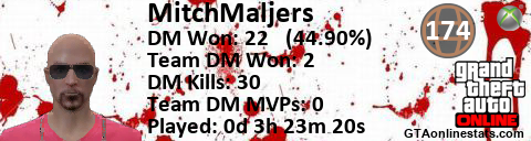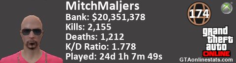 [URL=http://GTAonlinestats.com/showplayer/MitchMaljers][IMG]http://GTAonlinestats.com/dmsignature/MitchMaljers/sig.png[/IMG][/URL]