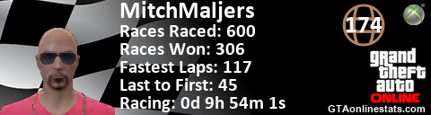 [URL=http://GTAonlinestats.com/showplayer/MitchMaljers][IMG]http://GTAonlinestats.com/racesignature/MitchMaljers/sig.png[/IMG][/URL]