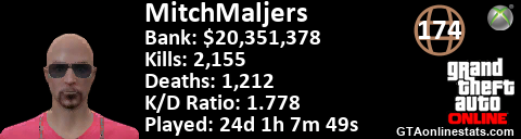 <a href="http://GTAonlinestats.com/showplayer/MitchMaljers"><img src="http://GTAonlinestats.com/dmsignature/MitchMaljers/sig.png" alt="MitchMaljers" border="0" /></a>