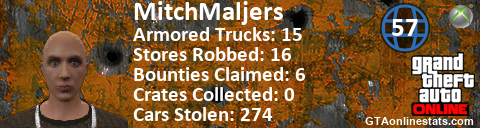 [URL=http://GTAonlinestats.com/showplayer/MitchMaljers/2][IMG]http://GTAonlinestats.com/crimesignature/MitchMaljers/2/sig.png[/IMG][/URL]