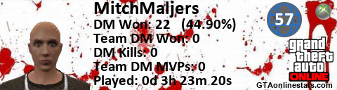 [URL=http://GTAonlinestats.com/showplayer/MitchMaljers/2][IMG]http://GTAonlinestats.com/dmsignature/MitchMaljers/2/sig.png[/IMG][/URL]