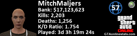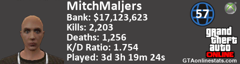 <a href="http://GTAonlinestats.com/showplayer/MitchMaljers/2"><img src="http://GTAonlinestats.com/dmsignature/MitchMaljers/2/sig.png" alt="MitchMaljers" border="0" /></a>