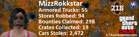 [URL=http://GTAonlinestats.com/showplayer/MizzRokkstar][IMG]http://GTAonlinestats.com/crimesignature/MizzRokkstar/sig.png[/IMG][/URL]
