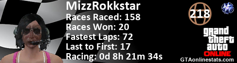 <a href="http://GTAonlinestats.com/showplayer/MizzRokkstar"><img src="http://GTAonlinestats.com/racesignature/MizzRokkstar/sig.png" alt="MizzRokkstar" border="0" /></a>