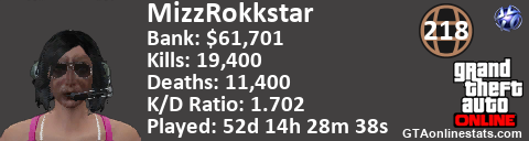 <a href="http://GTAonlinestats.com/showplayer/MizzRokkstar"><img src="http://GTAonlinestats.com/randomsignature/MizzRokkstar/sig.png" alt="MizzRokkstar" border="0" /></a>