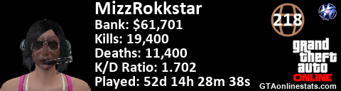 <a href="http://GTAonlinestats.com/showplayer/MizzRokkstar"><img src="http://GTAonlinestats.com/signature/MizzRokkstar/sig.png" alt="MizzRokkstar" border="0" /></a>