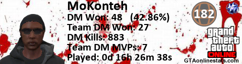 [URL=http://GTAonlinestats.com/showplayer/MoKonteh][IMG]http://GTAonlinestats.com/dmsignature/MoKonteh/sig.png[/IMG][/URL]