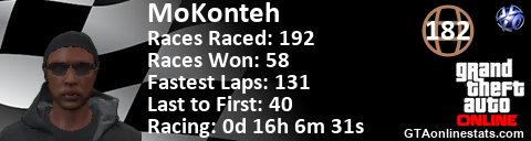 [URL=http://GTAonlinestats.com/showplayer/MoKonteh][IMG]http://GTAonlinestats.com/racesignature/MoKonteh/sig.png[/IMG][/URL]