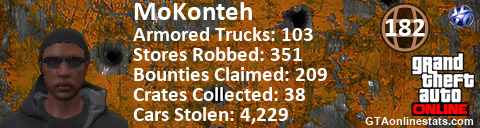 [URL=http://GTAonlinestats.com/showplayer/MoKonteh][IMG]http://GTAonlinestats.com/randomsignature/MoKonteh/sig.png[/IMG][/URL]
