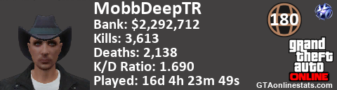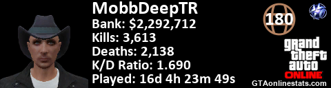 <a href="http://GTAonlinestats.com/showplayer/MobbDeepTR"><img src="http://GTAonlinestats.com/signature/MobbDeepTR/sig.png" alt="MobbDeepTR" border="0" /></a>