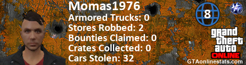 [URL=http://GTAonlinestats.com/showplayer/Momas1976/2][IMG]http://GTAonlinestats.com/crimesignature/Momas1976/2/sig.png[/IMG][/URL]