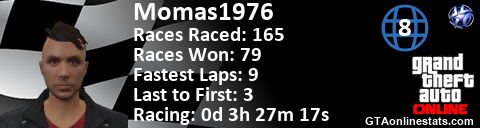 <a href="http://GTAonlinestats.com/showplayer/Momas1976/2"><img src="http://GTAonlinestats.com/racesignature/Momas1976/2/sig.png" alt="Momas1976" border="0" /></a>