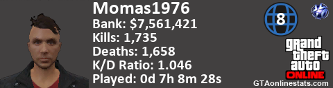 <a href="http://GTAonlinestats.com/showplayer/Momas1976/2"><img src="http://GTAonlinestats.com/randomsignature/Momas1976/2/sig.png" alt="Momas1976" border="0" /></a>