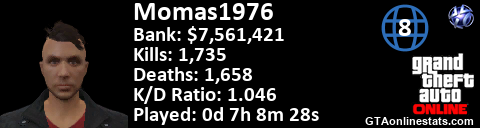 [URL=http://GTAonlinestats.com/showplayer/Momas1976/2][IMG]http://GTAonlinestats.com/signature/Momas1976/2/sig.png[/IMG][/URL]