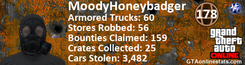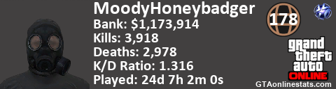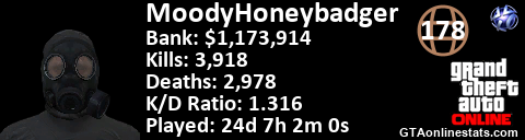 [URL=http://GTAonlinestats.com/showplayer/MoodyHoneybadger][IMG]http://GTAonlinestats.com/signature/MoodyHoneybadger/sig.png[/IMG][/URL]
