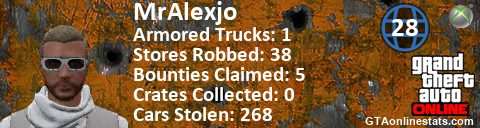 [URL=http://GTAonlinestats.com/showplayer/MrAlexjo][IMG]http://GTAonlinestats.com/crimesignature/MrAlexjo/sig.png[/IMG][/URL]