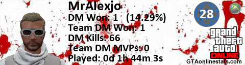 [URL=http://GTAonlinestats.com/showplayer/MrAlexjo][IMG]http://GTAonlinestats.com/dmsignature/MrAlexjo/sig.png[/IMG][/URL]