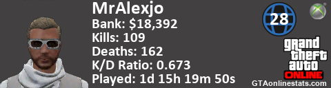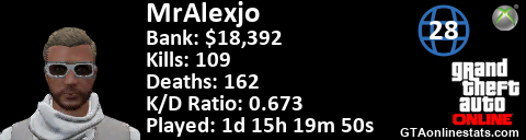 <a href="http://GTAonlinestats.com/showplayer/MrAlexjo"><img src="http://GTAonlinestats.com/signature/MrAlexjo/sig.png" alt="MrAlexjo" border="0" /></a>