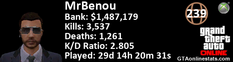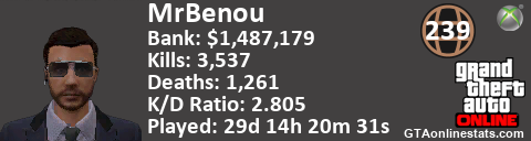 <a href="http://GTAonlinestats.com/showplayer/MrBenou"><img src="http://GTAonlinestats.com/dmsignature/MrBenou/sig.png" alt="MrBenou" border="0" /></a>