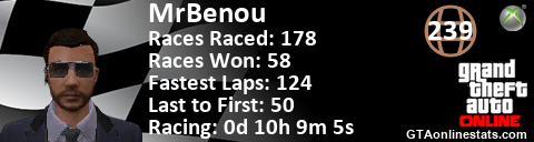 <a href="http://GTAonlinestats.com/showplayer/MrBenou"><img src="http://GTAonlinestats.com/racesignature/MrBenou/sig.png" alt="MrBenou" border="0" /></a>