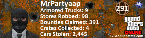 [URL=http://GTAonlinestats.com/showplayer/MrPartyaap][IMG]http://GTAonlinestats.com/crimesignature/MrPartyaap/sig.png[/IMG][/URL]