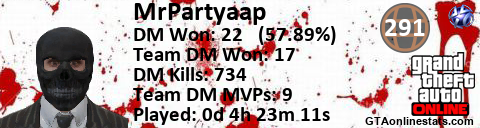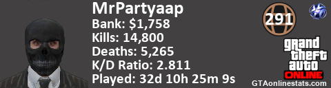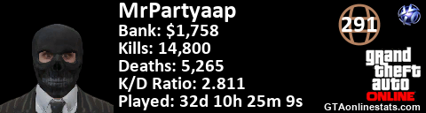 <a href="http://GTAonlinestats.com/showplayer/MrPartyaap"><img src="http://GTAonlinestats.com/dmsignature/MrPartyaap/sig.png" alt="MrPartyaap" border="0" /></a>