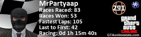 <a href="http://GTAonlinestats.com/showplayer/MrPartyaap"><img src="http://GTAonlinestats.com/racesignature/MrPartyaap/sig.png" alt="MrPartyaap" border="0" /></a>