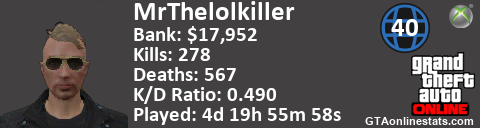 <a href="http://GTAonlinestats.com/showplayer/MrThelolkiller"><img src="http://GTAonlinestats.com/dmsignature/MrThelolkiller/sig.png" alt="MrThelolkiller" border="0" /></a>