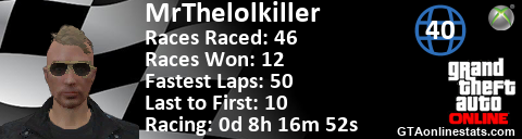 <a href="http://GTAonlinestats.com/showplayer/MrThelolkiller"><img src="http://GTAonlinestats.com/racesignature/MrThelolkiller/sig.png" alt="MrThelolkiller" border="0" /></a>