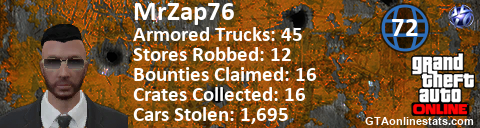 [URL=http://GTAonlinestats.com/showplayer/MrZap76/2][IMG]http://GTAonlinestats.com/crimesignature/MrZap76/2/sig.png[/IMG][/URL]