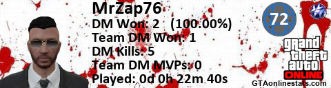 [URL=http://GTAonlinestats.com/showplayer/MrZap76/2][IMG]http://GTAonlinestats.com/dmsignature/MrZap76/2/sig.png[/IMG][/URL]