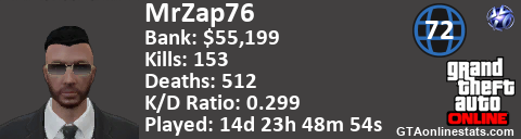 [URL=http://GTAonlinestats.com/showplayer/MrZap76/2][IMG]http://GTAonlinestats.com/signature/MrZap76/2/sig.png[/IMG][/URL]