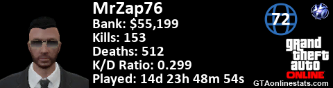 [URL=http://GTAonlinestats.com/showplayer/MrZap76/2][IMG]http://GTAonlinestats.com/randomsignature/MrZap76/2/sig.png[/IMG][/URL]