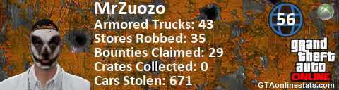 [URL=http://GTAonlinestats.com/showplayer/MrZuozo][IMG]http://GTAonlinestats.com/crimesignature/MrZuozo/sig.png[/IMG][/URL]
