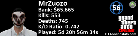 [URL=http://GTAonlinestats.com/showplayer/MrZuozo][IMG]http://GTAonlinestats.com/signature/MrZuozo/sig.png[/IMG][/URL]