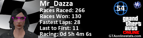 [URL=http://GTAonlinestats.com/showplayer/Mr_Dazza/2][IMG]http://GTAonlinestats.com/racesignature/Mr_Dazza/2/sig.png[/IMG][/URL]