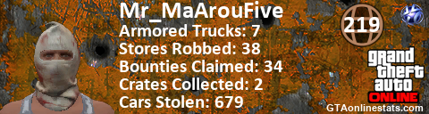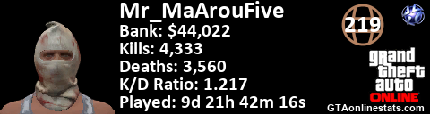 <a href="http://GTAonlinestats.com/showplayer/Mr_MaArouFive"><img src="http://GTAonlinestats.com/randomsignature/Mr_MaArouFive/sig.png" alt="Mr_MaArouFiVE" border="0" /></a>