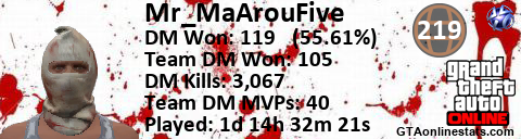 [URL=http://GTAonlinestats.com/showplayer/Mr_MaArouFive][IMG]http://GTAonlinestats.com/dmsignature/Mr_MaArouFive/sig.png[/IMG][/URL]
