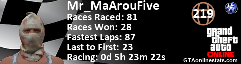 <a href="http://GTAonlinestats.com/showplayer/Mr_MaArouFive"><img src="http://GTAonlinestats.com/racesignature/Mr_MaArouFive/sig.png" alt="Mr_MaArouFiVE" border="0" /></a>