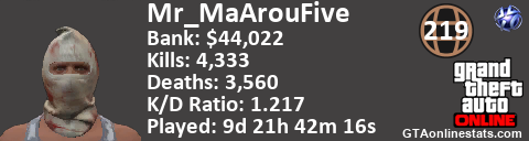 <a href="http://GTAonlinestats.com/showplayer/Mr_MaArouFive"><img src="http://GTAonlinestats.com/dmsignature/Mr_MaArouFive/sig.png" alt="Mr_MaArouFiVE" border="0" /></a>