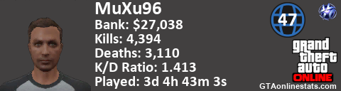 <a href="http://GTAonlinestats.com/showplayer/MuXu96/2"><img src="http://GTAonlinestats.com/greysignature/MuXu96/2/sig.png" alt="MuXu96" border="0" /></a>