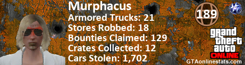 [URL=http://GTAonlinestats.com/showplayer/Murphacus][IMG]http://GTAonlinestats.com/randomsignature/Murphacus/sig.png[/IMG][/URL]