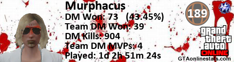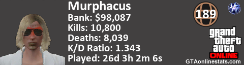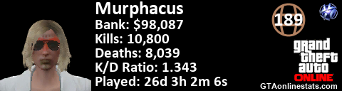 [URL=http://GTAonlinestats.com/showplayer/Murphacus][IMG]http://GTAonlinestats.com/dmsignature/Murphacus/sig.png[/IMG][/URL]