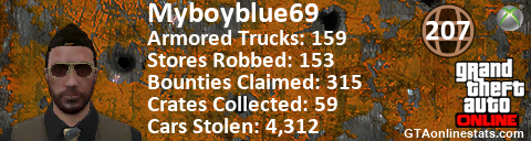 [URL=http://GTAonlinestats.com/showplayer/Myboyblue69][IMG]http://GTAonlinestats.com/crimesignature/Myboyblue69/sig.png[/IMG][/URL]