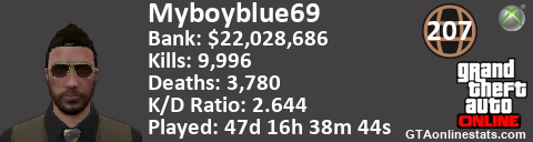 [URL=http://GTAonlinestats.com/showplayer/Myboyblue69][IMG]http://GTAonlinestats.com/randomsignature/Myboyblue69/sig.png[/IMG][/URL]