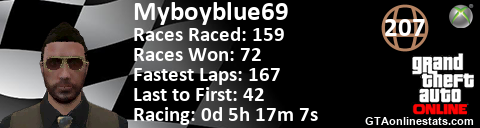 [URL=http://GTAonlinestats.com/showplayer/Myboyblue69][IMG]http://GTAonlinestats.com/racesignature/Myboyblue69/sig.png[/IMG][/URL]